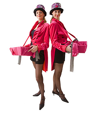 Uitgedost in een roze jacquet met een opvallende hoed presenteren de Ladies in Pink de koptelefoons. Vanuit hun roze presenteertableau kunnen ze ook sjaaltjes, bling bling sieraden, pruiken en zonnebrillen uitdelen.